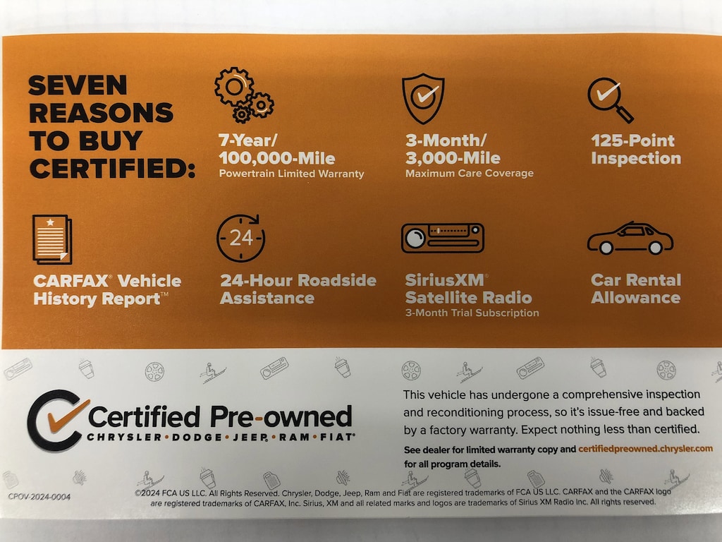 CERTIFIED PRE-OWNED!!! The vehicle underwent a 125-Point Inspection/Reconditioning process and comes with a 7-Year/100K mile factory powertrain warranty, along with a 3-month/3K mile factory Maximum Care Warranty! (If the vehicle is still under the original factory 3-year/36K mile warranty, that would run concurrent with the 3-mo/3K mile warranty). Also included at no extra cost is 24 Hour Roadside Assistance, Car Rental Allowance, and a 3-month SiriusXM Satellite Radio trial.