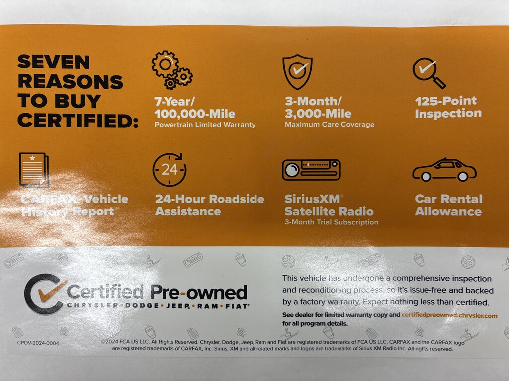 CERTIFIED PRE-OWNED!!! The vehicle underwent a 125-Point Inspection/Reconditioning process and comes with a 7-Year/100K mile factory powertrain warranty, along with a 3-month/3K mile factory Maximum Care Warranty! (If the vehicle is still under the original factory 3-year/36K mile warranty, that would run concurrent with the 3-mo/3K mile warranty). Also included at no extra cost is 24 Hour Roadside Assistance, Car Rental Allowance, and a 3-month SiriusXM Satellite Radio trial.