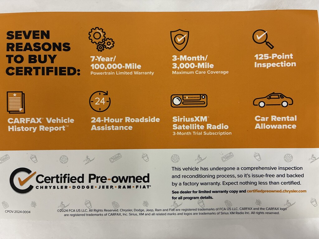 CERTIFIED PRE-OWNED!!! The vehicle underwent a 125-Point Inspection/Reconditioning process and comes with a 7-Year/100K mile factory powertrain warranty, along with a 3-month/3K mile factory Maximum Care Warranty! (If the vehicle is still under the original factory 3-year/36K mile warranty, that would run concurrent with the 3-mo/3K mile warranty). Also included at no extra cost is 24 Hour Roadside Assistance, Car Rental Allowance, and a 3-month SiriusXM Satellite Radio trial.