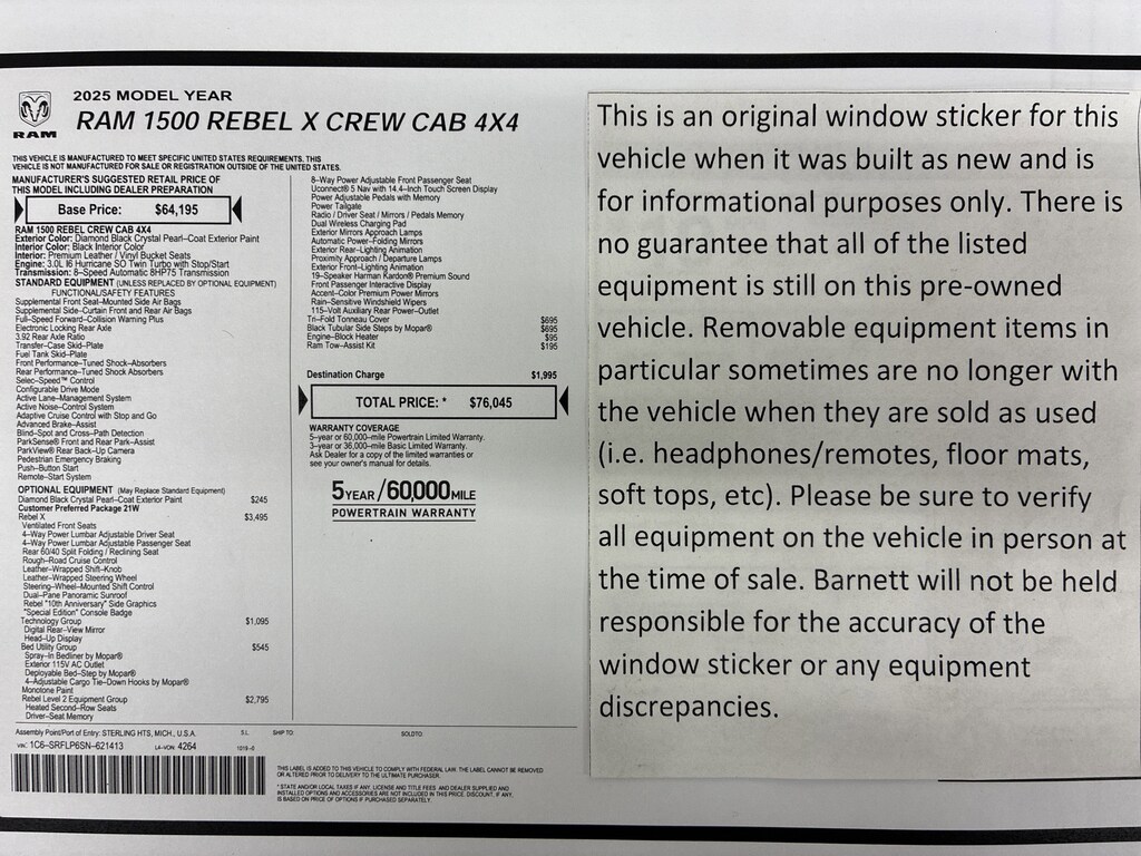 "The vehicle equipment list is auto generated and errors in listed equipment may occur. Please be sure to verify all equipment on the vehicle in person at time of sale as this list may not be 100% accurate. Barnett will not be held responsible for the accuracy of this list."