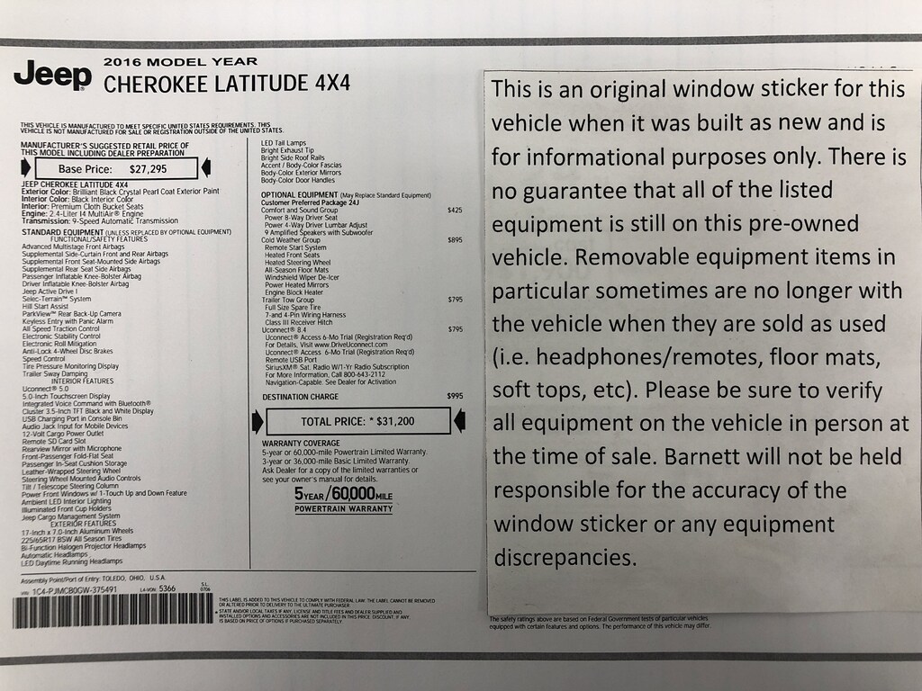 Listed selling price includes a $1000 Barnett Trade Bonus. Trade-in vehicles no more than 10 years old and 100K miles or less with a clean title automatically qualify. Trade-in vehicles outside these parameters need to be discussed and reviewed in person with the dealership to determine qualification. "The vehicle equipment list is auto generated and errors in listed equipment may occur. Please be sure to verify all equipment on the vehicle in person at time of sale as this list may not be 100% accurate. Barnett will not be held responsible for the accuracy of this list."