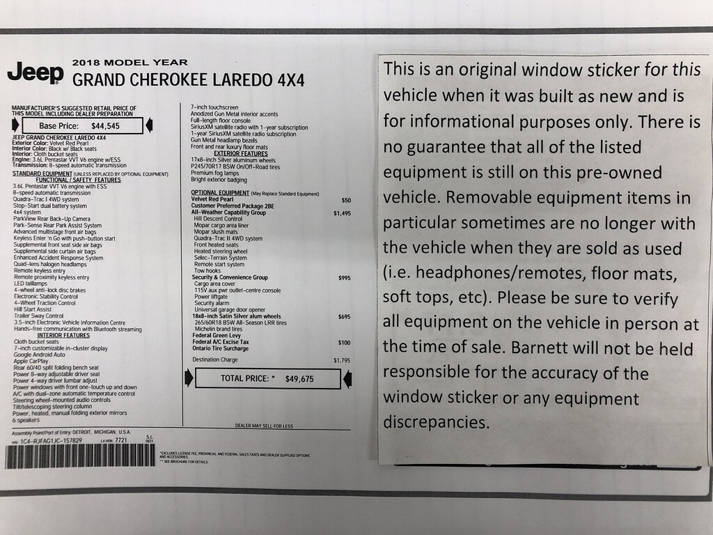 Listed selling price includes a $1000 Barnett Trade Bonus. Trade-in vehicles no more than 10 years old and 100K miles or less with a clean title automatically qualify. Trade-in vehicles outside these parameters need to be discussed and reviewed in person with the dealership to determine qualification. "The vehicle equipment list is auto generated and errors in listed equipment may occur. Please be sure to verify all equipment on the vehicle in person at time of sale as this list may not be 100% accurate. Barnett will not be held responsible for the accuracy of this list."