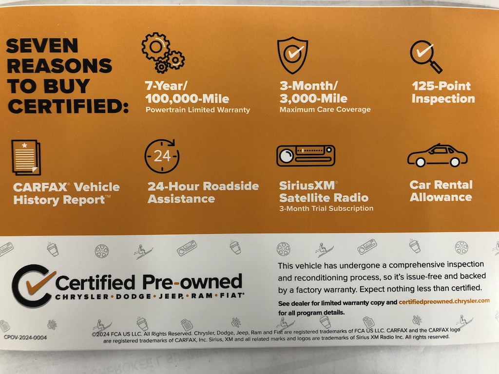 CERTIFIED PRE-OWNED!!! The vehicle underwent a 125-Point Inspection/Reconditioning process and comes with a 7-Year/100K mile factory powertrain warranty, along with a 3-month/3K mile factory Maximum Care Warranty! (If the vehicle is still under the original factory 3-year/36K mile warranty, that would run concurrent with the 3-mo/3K mile warranty). Also included at no extra cost is 24 Hour Roadside Assistance, Car Rental Allowance, and a 3-month SiriusXM Satellite Radio trial.