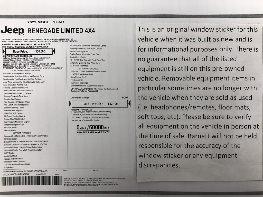 Listed selling price includes a $1000 Barnett Trade Bonus. Trade-in vehicles no more than 10 years old and 100K miles or less with a clean title automatically qualify. Trade-in vehicles outside these parameters need to be discussed and reviewed in person with the dealership to determine qualification. "The vehicle equipment list is auto generated and errors in listed equipment may occur. Please be sure to verify all equipment on the vehicle in person at time of sale as this list may not be 100% accurate. Barnett will not be held responsible for the accuracy of this list."