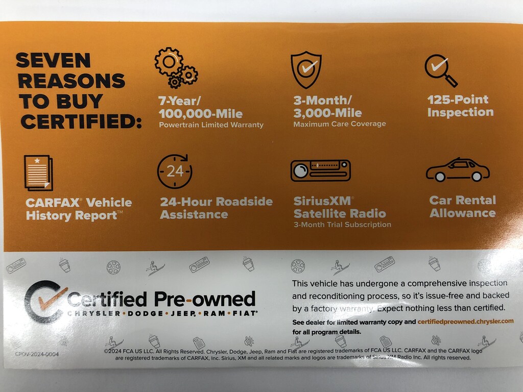 CERTIFIED PRE-OWNED!!! The vehicle underwent a 125-Point Inspection/Reconditioning process and comes with a 7-Year/100K mile factory powertrain warranty, along with a 3-month/3K mile factory Maximum Care Warranty! (If the vehicle is still under the original factory 3-year/36K mile warranty, that would run concurrent with the 3-mo/3K mile warranty). Also included at no extra cost is 24 Hour Roadside Assistance, Car Rental Allowance, and a 3-month SiriusXM Satellite Radio trial.