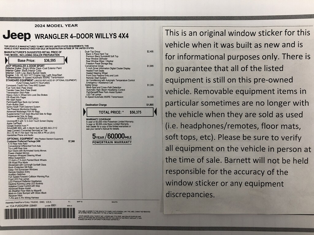 - QUICK ORDER PACKAGE 24W WILLYS -inc: Engine: 3.6L V6 24V VVT UPG I w/ESS Transmission: 8-Speed Automatic (850RE) Speed Sensitive Power Locks 7 & 4 Pin Wiring Harness Conventional Differential Front Axle 4-Wheel Drive Swing Gate Decal Black Grille Injection Molded Black Rear Bumper Dana M210 Wide HD Tube Front Axle Front 1-Touch Down Power Windows Daytime Running Lamps LED Accents Front LED Fog Lamps LED Premium Reflector Headlamps E-Locker Rear Axle Corning Gorilla Glass Security Alarm Willys Class II Receiver Hitch Mold In Color Bumper w/Gloss Black Advanced Brake Assist Automatic Headlamps Off-Road Plus Mode 240 Amp Alternator Willys Hood Decal Full Speed Forward Collision Warning Plus Rock Protection Sill Rails 97 MPH Vehicle Max Speed Calibration Power Heated Mirrors Enhanced Adaptive Cruise Control Auxiliary Switches Dana M220 Wide Rear Axle Molded in Color Rubicon Highline Flare Premium Wrapped Steering Wheel Sun Visors w/Illuminated Vanity Mirro