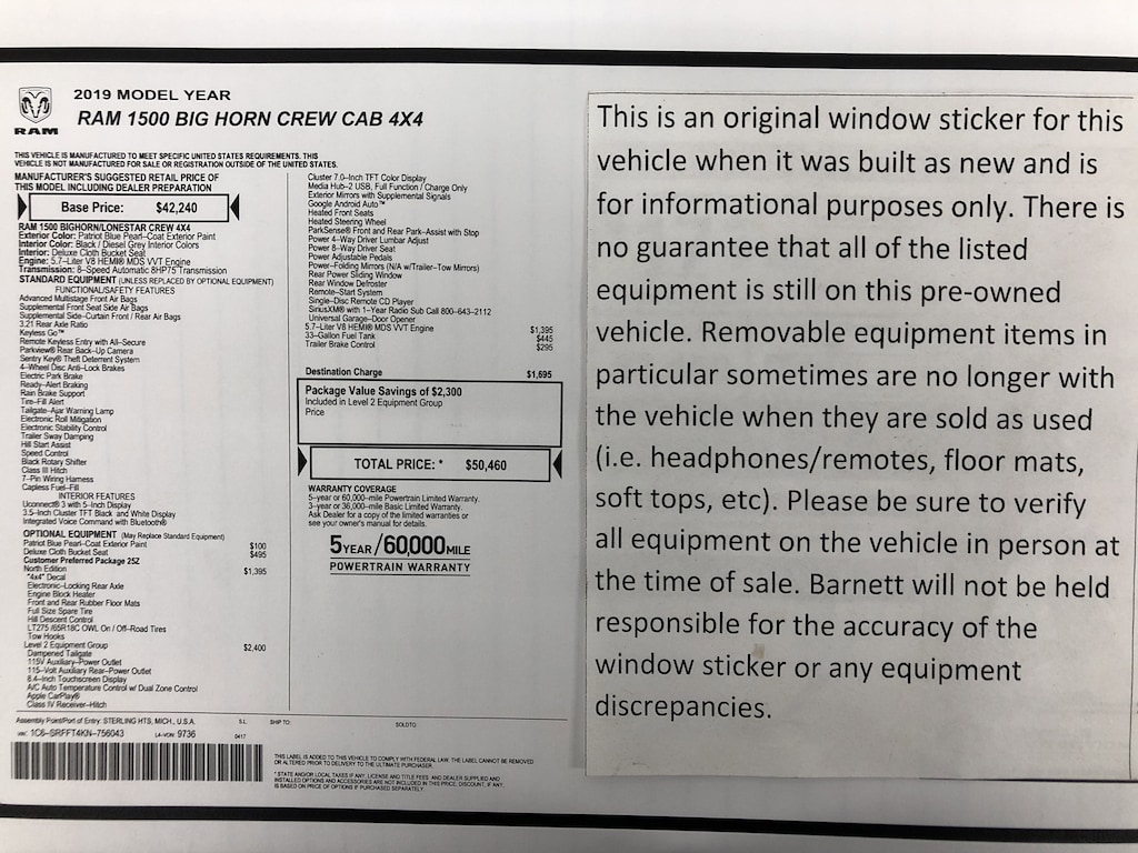 - BIG HORN LEVEL 2 EQUIPMENT GROUP -inc: Radio: Uconnect 4 w/8.4" Display Rear Window Defroster Integrated Center Stack Radio ParkSense Front/Rear Park Assist w/Stop Rear View Auto Dim Mirror Power Adjustable Pedals Rear Power Sliding Window Rear Dome w/On/Off Switch Lamp Glove Box Lamp Power 4-Way Driver Lumbar Adjust 115V Auxiliary Rear Power Outlet Power 8-Way Driver Seat 2 USB Full Function/Charge Only Media Hub Heated Front Seats Heated Steering Wheel 8.4" Touchscreen Display Foam Bottle Insert (Door Trim Panel) Class IV Receiver Hitch Dampened Tailgate Security Alarm Power Heated Fold Away Mirrors Big Horn IP Badge Remote Start System SiriusXM Satellite Radio 400W Inverter Air Conditioning ATC w/Dual Zone Control 115V Auxiliary Power Outlet Cluster 7.0" TFT Color Display Universal Garage Door Opener Single Disc Remote CD Player Sun Visors w/Illuminated Vanity Mirrors