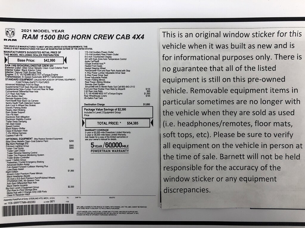 "The vehicle equipment list is auto generated and errors in listed equipment may occur. Please be sure to verify all equipment on the vehicle in person at time of sale as this list may not be 100% accurate. Barnett will not be held responsible for the accuracy of this list."