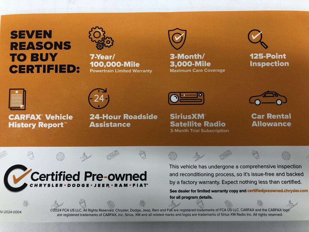 CERTIFIED PRE-OWNED!!! The vehicle underwent a 125-Point Inspection/Reconditioning process and comes with a 7-Year/100K mile factory powertrain warranty, along with a 3-month/3K mile factory Maximum Care Warranty! (If the vehicle is still under the original factory 3-year/36K mile warranty, that would run concurrent with the 3-mo/3K mile warranty). Also included at no extra cost is 24 Hour Roadside Assistance, Car Rental Allowance, and a 3-month SiriusXM Satellite Radio trial.