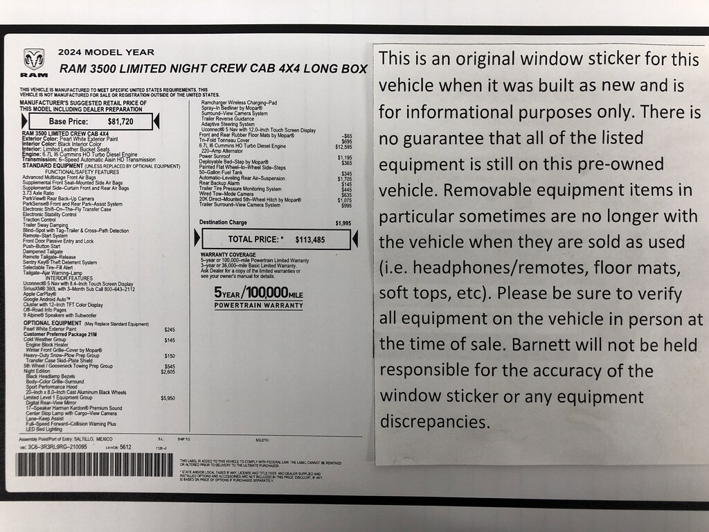 Listed selling price includes a $1000 Barnett Trade Bonus. Trade-in vehicles no more than 10 years old and 100K miles or less with a clean title automatically qualify. Trade-in vehicles outside these parameters need to be discussed and reviewed in person with the dealership to determine qualification. "The vehicle equipment list is auto generated and errors in listed equipment may occur. Please be sure to verify all equipment on the vehicle in person at time of sale as this list may not be 100% accurate. Barnett will not be held responsible for the accuracy of this list."