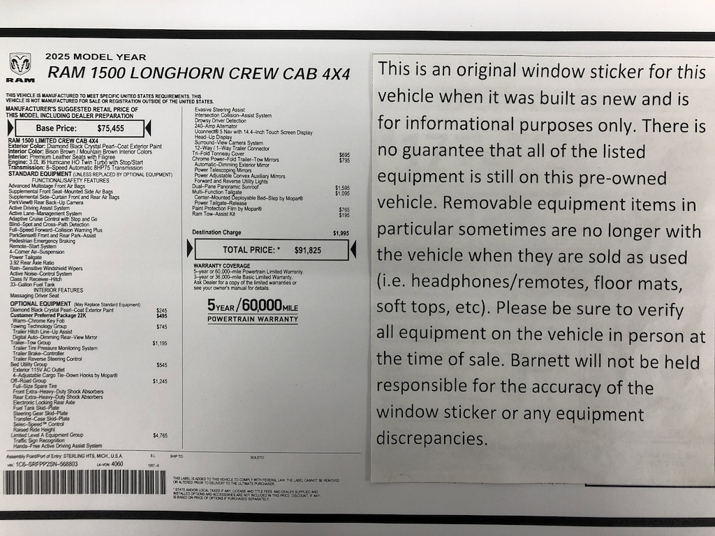 "The vehicle equipment list is auto generated and errors in listed equipment may occur. Please be sure to verify all equipment on the vehicle in person at time of sale as this list may not be 100% accurate. Barnett will not be held responsible for the accuracy of this list."